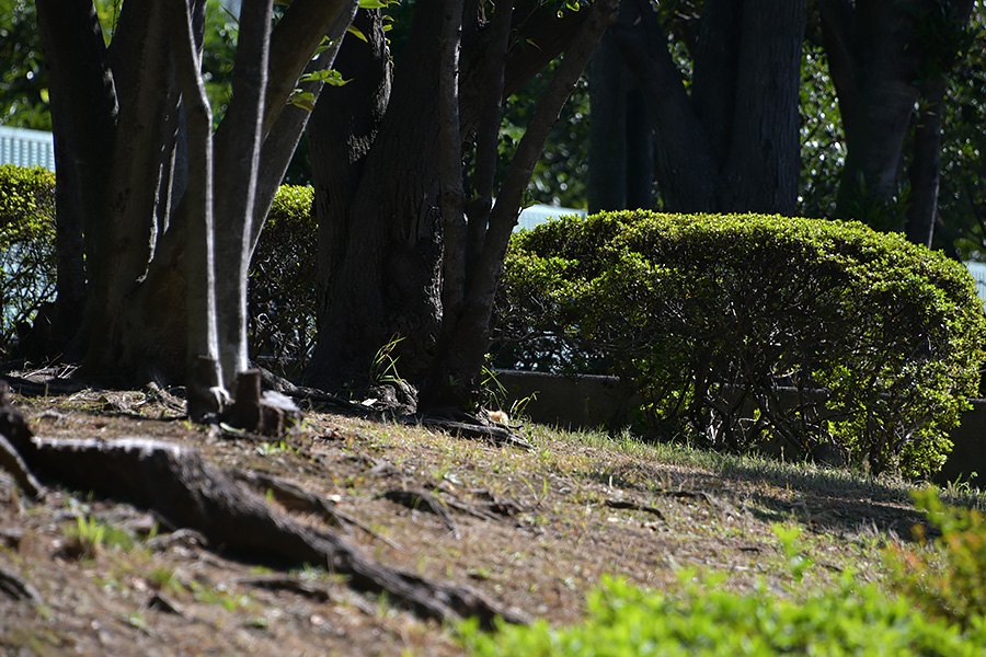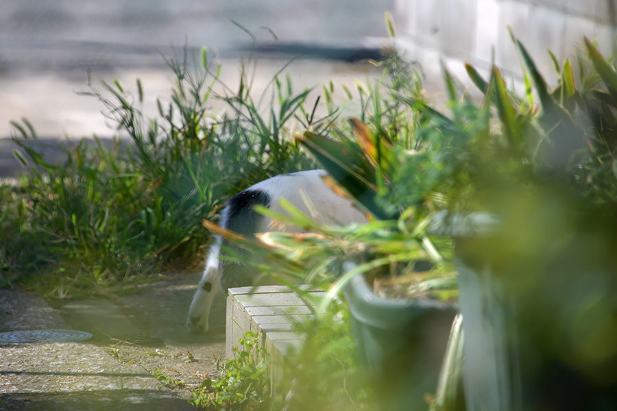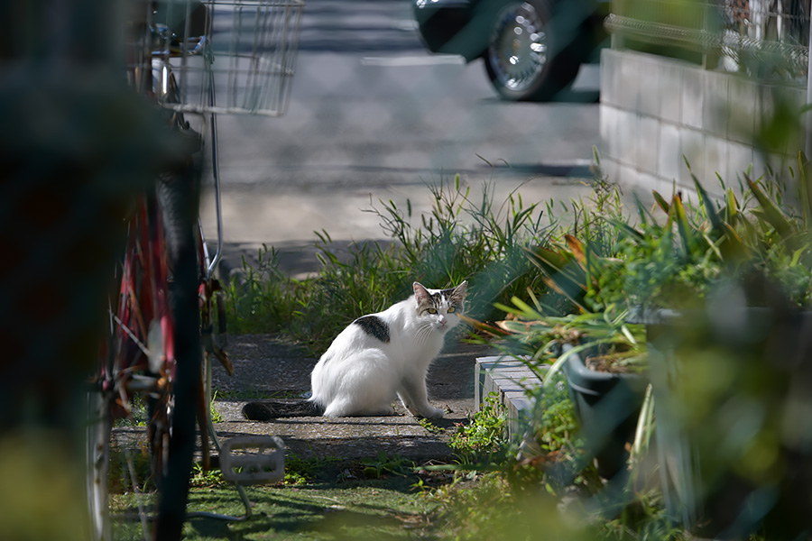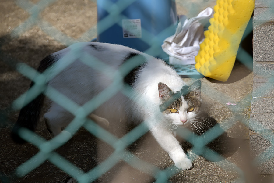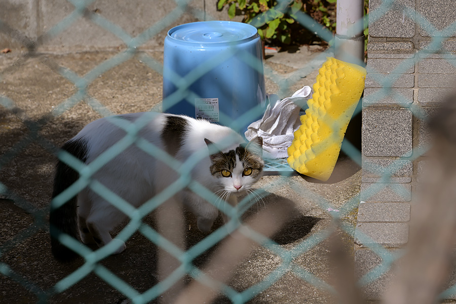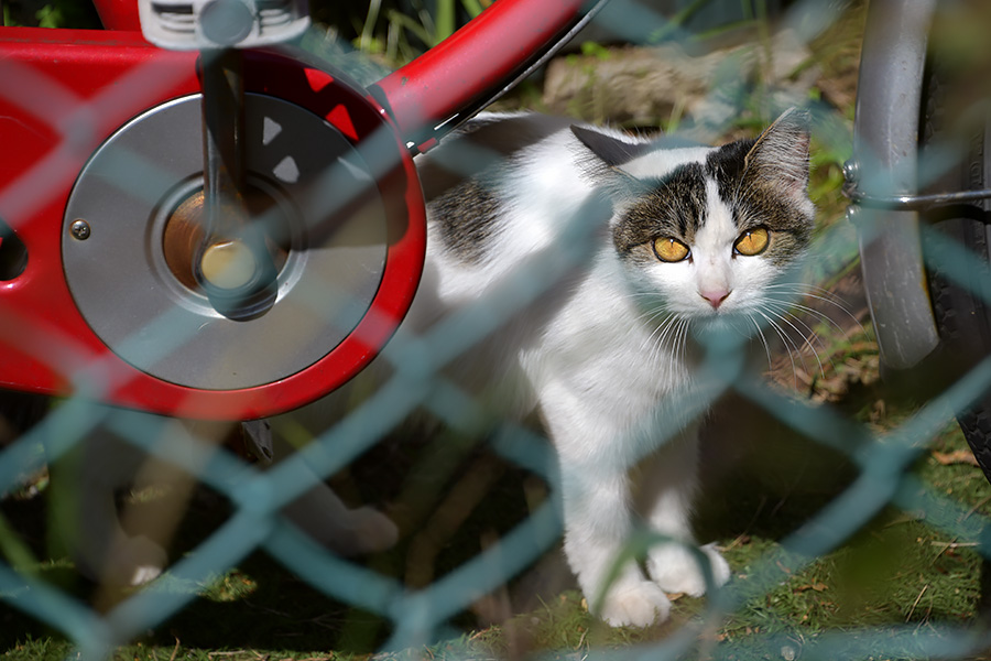 フェンスの向こうにキジ白ねこさんを見つけました。